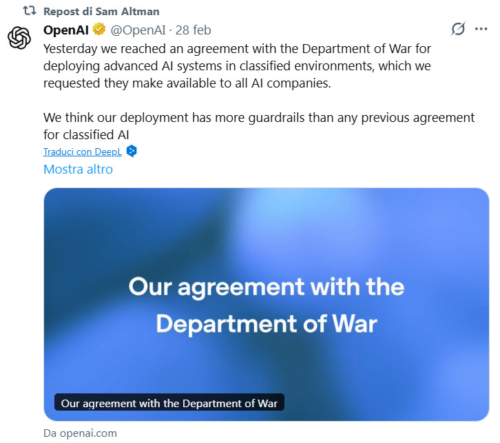 However, soon after, Altman declared that OpenAI would maintain the same guardrails and safeguards requested by Anthropic and that the deal looked “opportunistic and sloppy”.